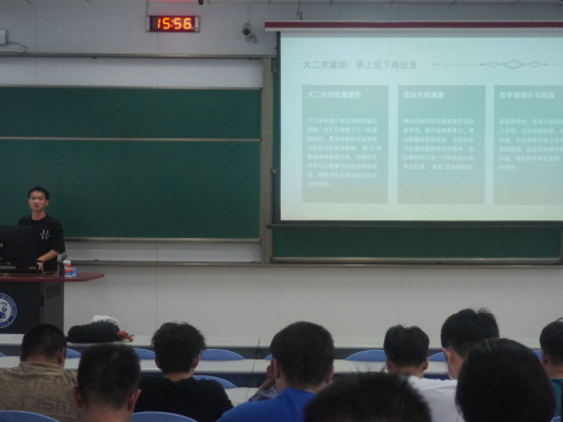 班会伊始,班长黄逍遥围绕“大二关键期:承上启下再出发”展开,指出大二在大学生涯中承前启后的关键地位,既要巩固大一学习的基础知识,也要为后续的专业学习、科研与实践项目做好铺垫。他鼓励大家从被动适应转向主动规划,并提出了班级共同愿景:营造优良学风、提升整体竞争力,建设积极向上的学习氛围,争创“优良标兵班”。他呼吁同学们在新学期明确目标、突破自我、携手进步。