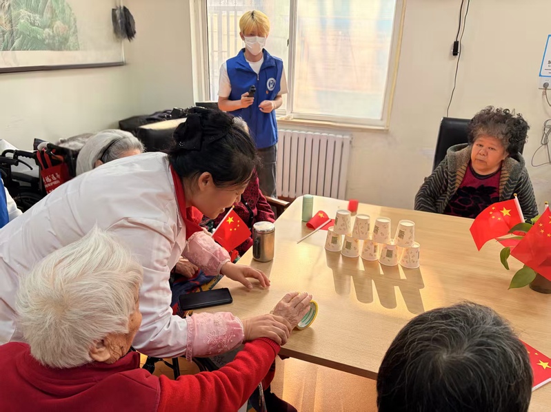 趣味游戏“碰碰水瓶”将活动推向高潮。支部成员用安全的一次性纸杯与胶带搭建简易游戏装置,引导老人们参与互动。老人们兴致盎然地参与其中,在轻松的游戏中舒展筋骨、收获快乐,活动室里不时响起阵阵欢声笑语。
