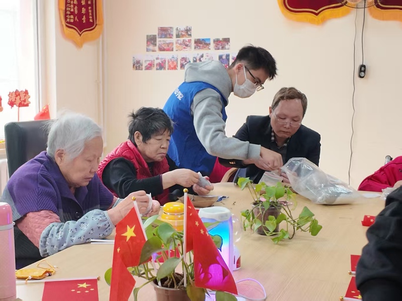 在红歌合唱环节,老人们与支部成员们手持五星红旗,共同唱响《歌唱祖国》《我和我的祖国》等经典红歌。熟悉的旋律回荡在活动室中,大家跟着节奏轻轻挥舞旗帜,歌声里饱含着对祖国的热爱与对美好生活的赞颂,现场氛围热烈而真挚,不少老人眼中泛起感动的泪光。