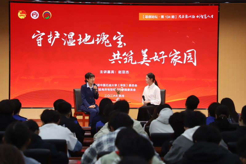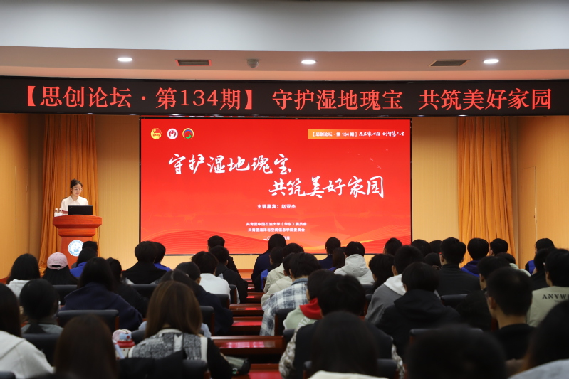 4月11日,中国石油大学(华东)第134期思创论坛在逸夫报告厅顺利开展,特邀“全国三八红旗手”“中国青年五四奖章”获得者、山东黄河三角洲国家级自然保护区管理委员会监测中心副主任赵亚杰主讲,与学院师生共话湿地保护,凝聚青年生态守护力量。本次论坛由中国石油大学(华东)与中国海洋湖沼学会信息技术委员会联合举办。