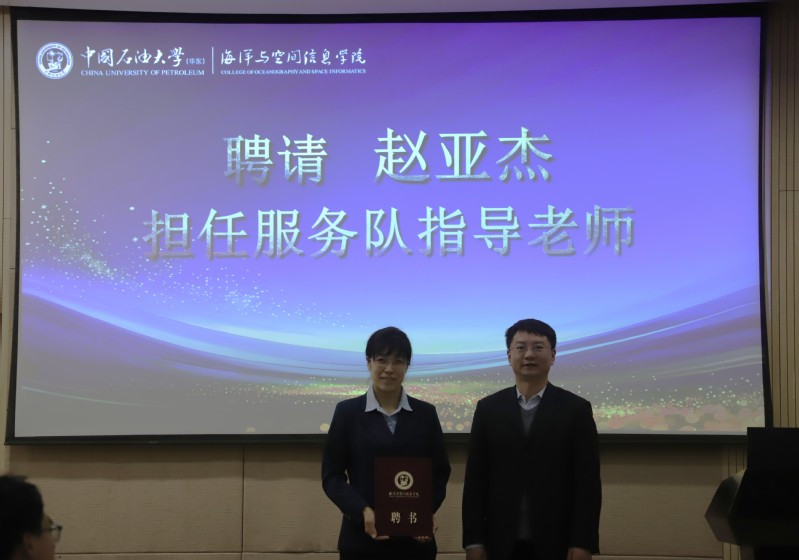 会议举行聘任仪式,海空学院党委副书记于华帅为赵亚杰颁发聘书,正式聘任其为海浪花志愿服务队指导教师,助力团队生态保护与科普工作专业化发展。