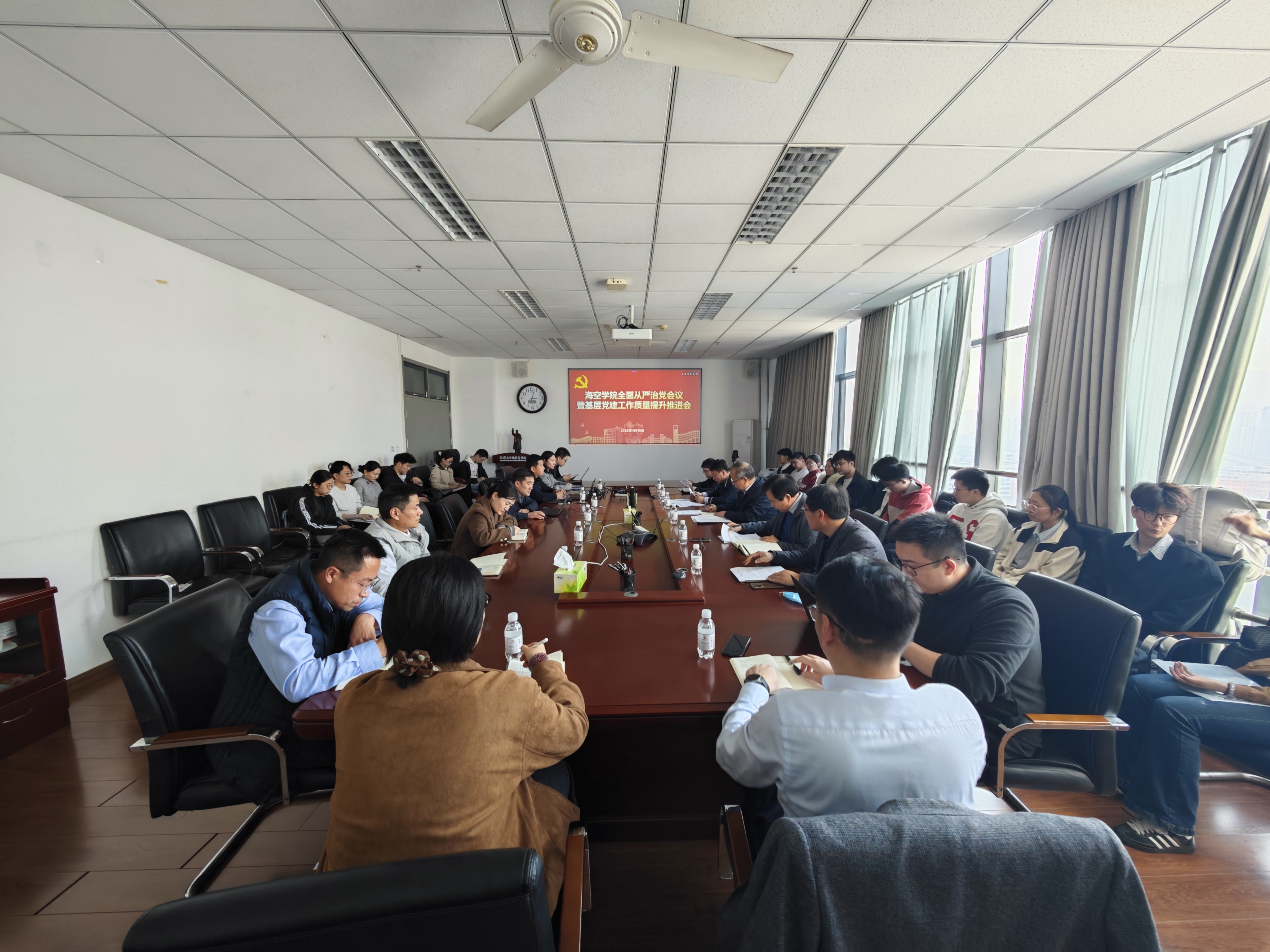 为深入学习贯彻习近平总书记关于全面从严治党工作的重要论述,扎实推进树立和践行正确政绩观学习教育,认真落实学校全面从严治党会议精神,总结过去一年学院全面从严治党工作,安排部署2026年重点任务,以高质量党建引领学院事业高质量发展,4月10日下午,海空学院召开了全面从严治党会议暨基层党建质量提升推进会。学院党委委员、院班子成员,党委组织员、各教学系主任、党支部书记,学生党支部书记、辅导员等参加会议。会议由学院党委副书记于华帅主持。