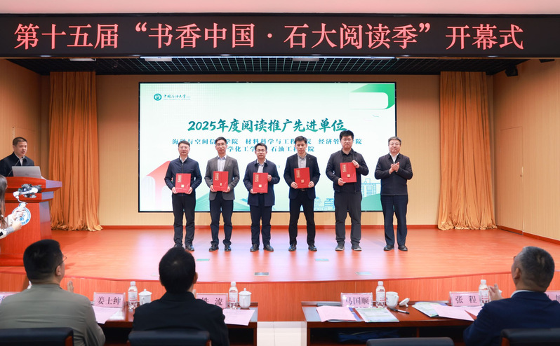 近日,学校第十五届“书香中国·石大阅读季”开幕式在逸夫楼报告厅隆重举行,会上对2025年度阅读推广工作先进单位、先进个人及优秀项目予以表彰。经材料评比、综合评议,海洋与空间信息学院获评“阅读推广工作先进单位”(左1)。